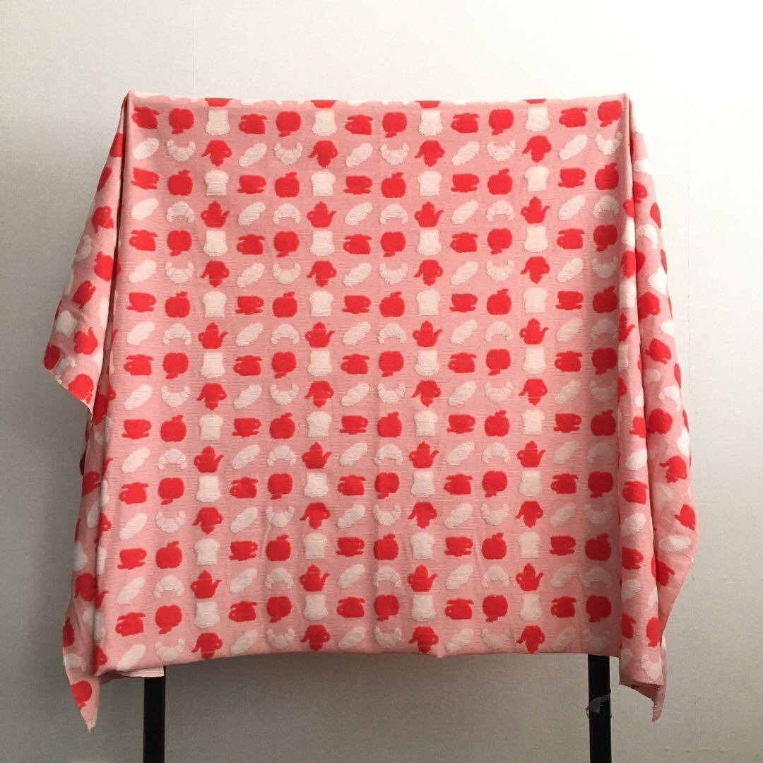 オレンジとホワイトの糸を交互に編立てて杢調の天竺目で構成。パイルジャガードはオレンジとホワイトではっきりと分かれるように加工し起毛タッチのほわほわ感です。パン・ポット・リンゴのなんとも可愛らしい柄です^^