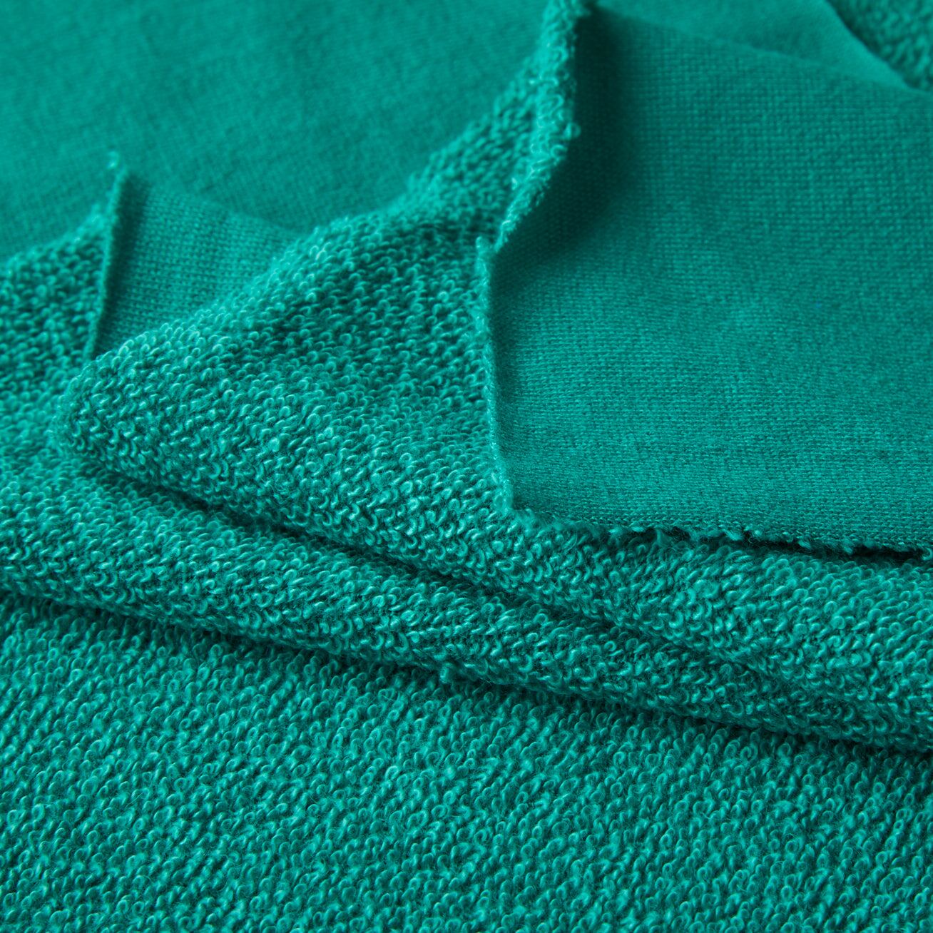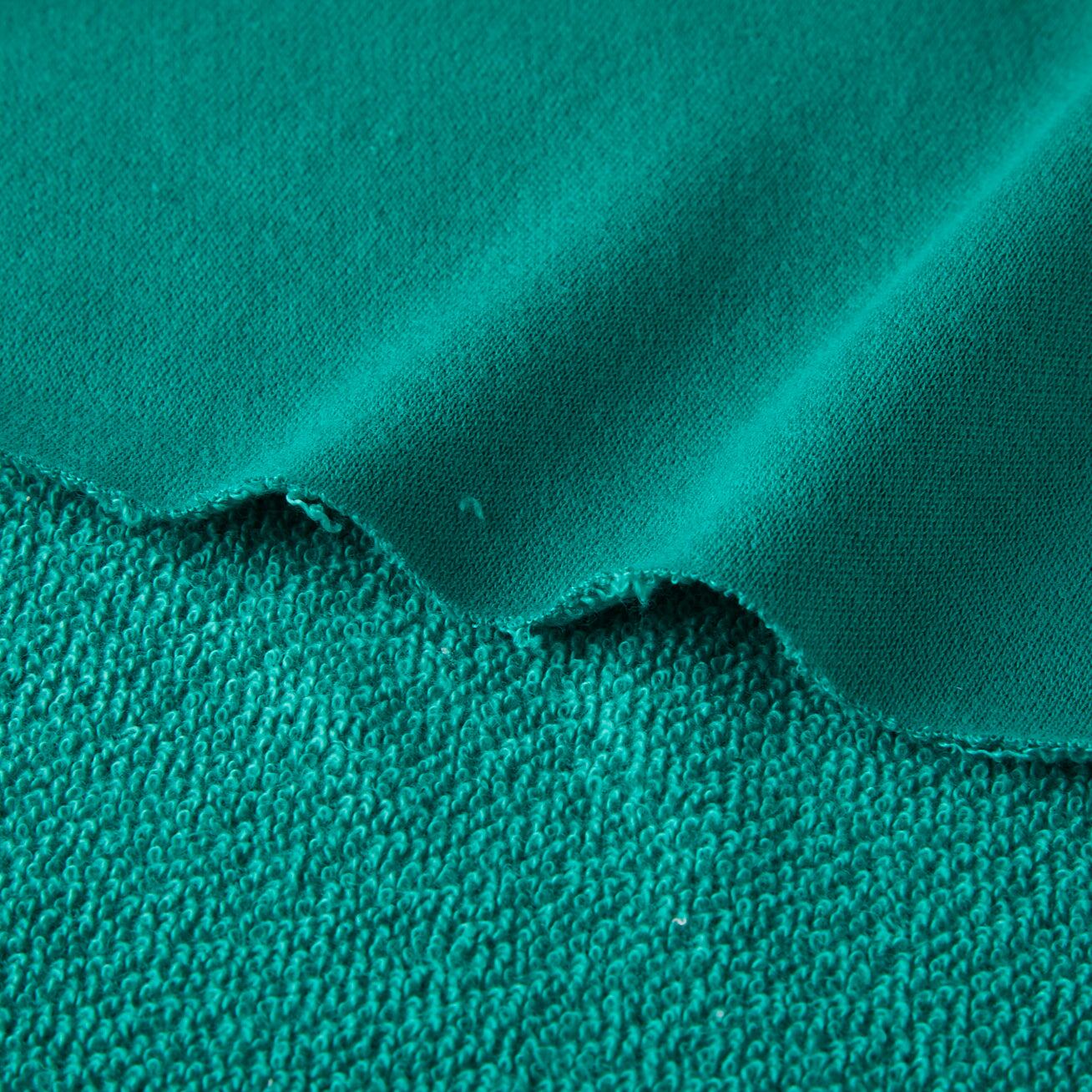 裏毛素材は、裏面に毛羽立ちを持たせた編地のことで、肌に触れる面がやわらかく保温性に優れています。通常、綿やポリエステルなどが使用され、スポーツウェアやカジュアルウェアなどに用いられることが多い素材です。